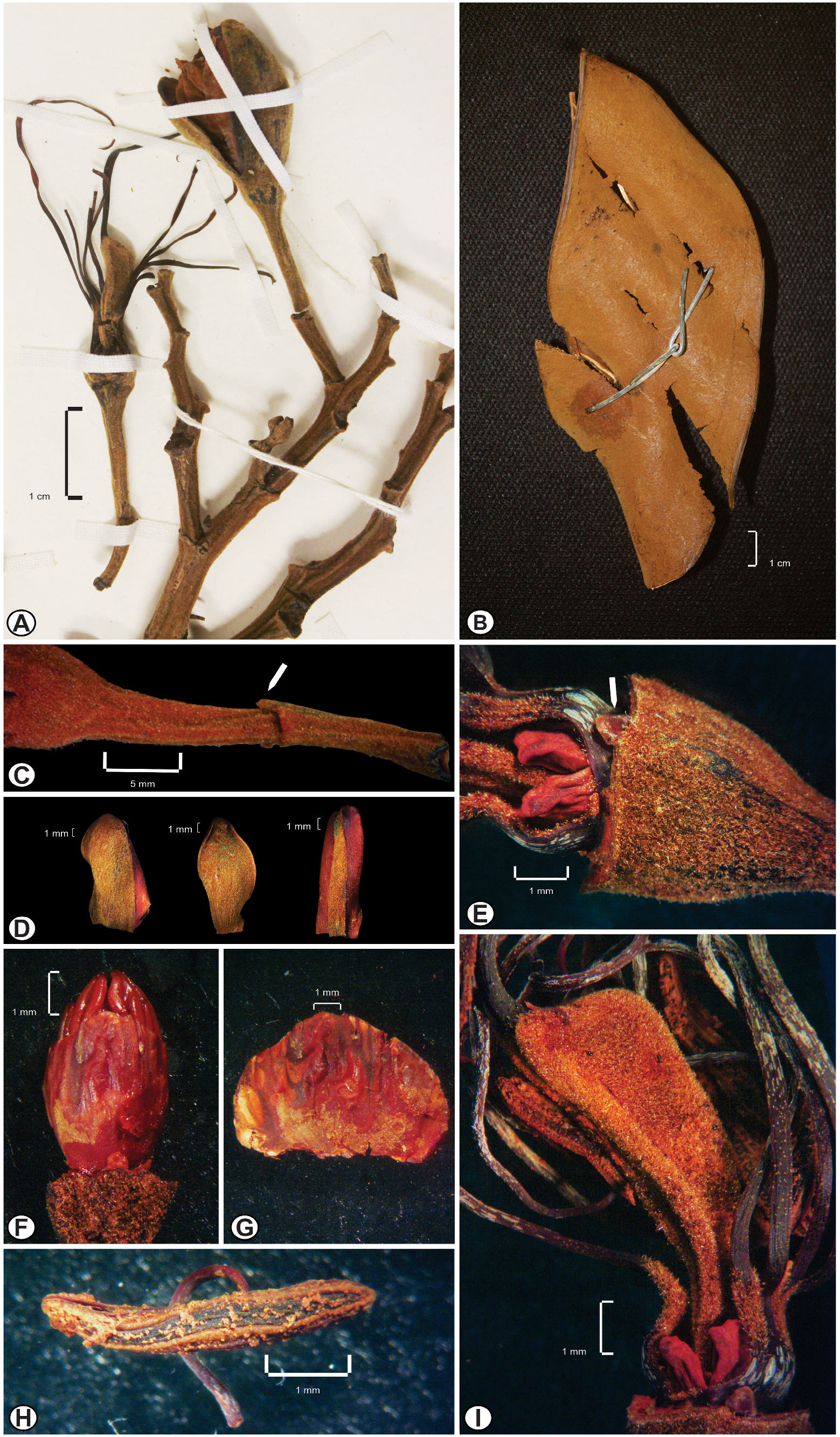 FIGURE 49. Eperua reddeniae: A. flower in pre-anthesis and other showing the carpel and stamens (sepals and adaxial petal removed); B. fruit; C. pedicel showing the bracteoles scar (white arrow) on its middle portion; D. sepals; E. detail of the hypanthium, petalodia (white arrow), base of the stamens, and intrastaminal nectaries; F. bud showing the adaxial petal and part of the anthers (sepals removed); G. adaxial petal from a bud; H. anther and part of the filament; I. base of the stamens joined in a diadelphous sheath (free stamen on the left) and tomentose carpel. Specimens, Redden K.M. et al. 3274. Photos, E.A. Fortes.
