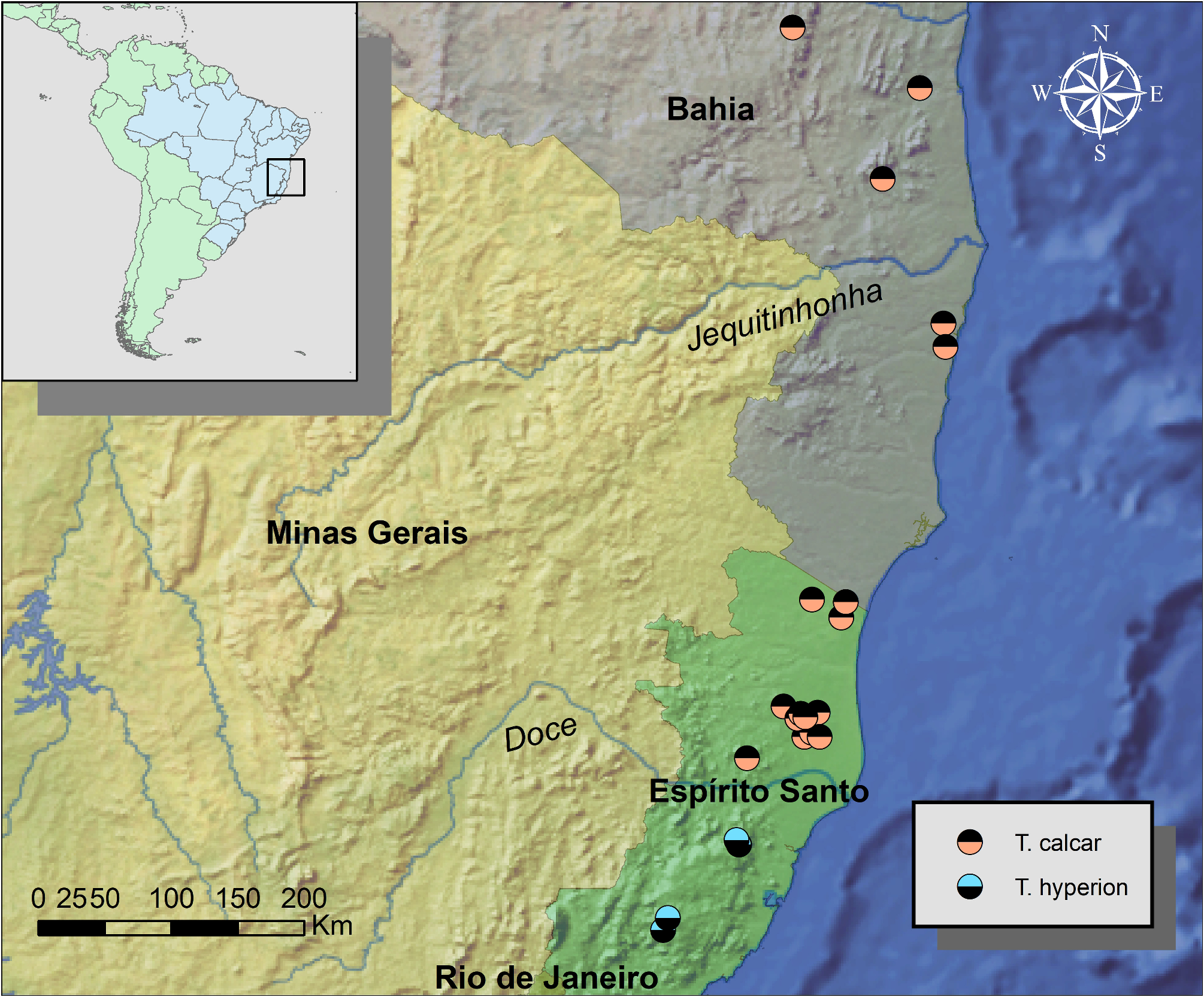 FIGURE 14. Eastern Brazil, showing the distribution of the two robust species of Titanoleptes gen. nov., which are allopatrid, distributed in opposite margins of the Doce river.