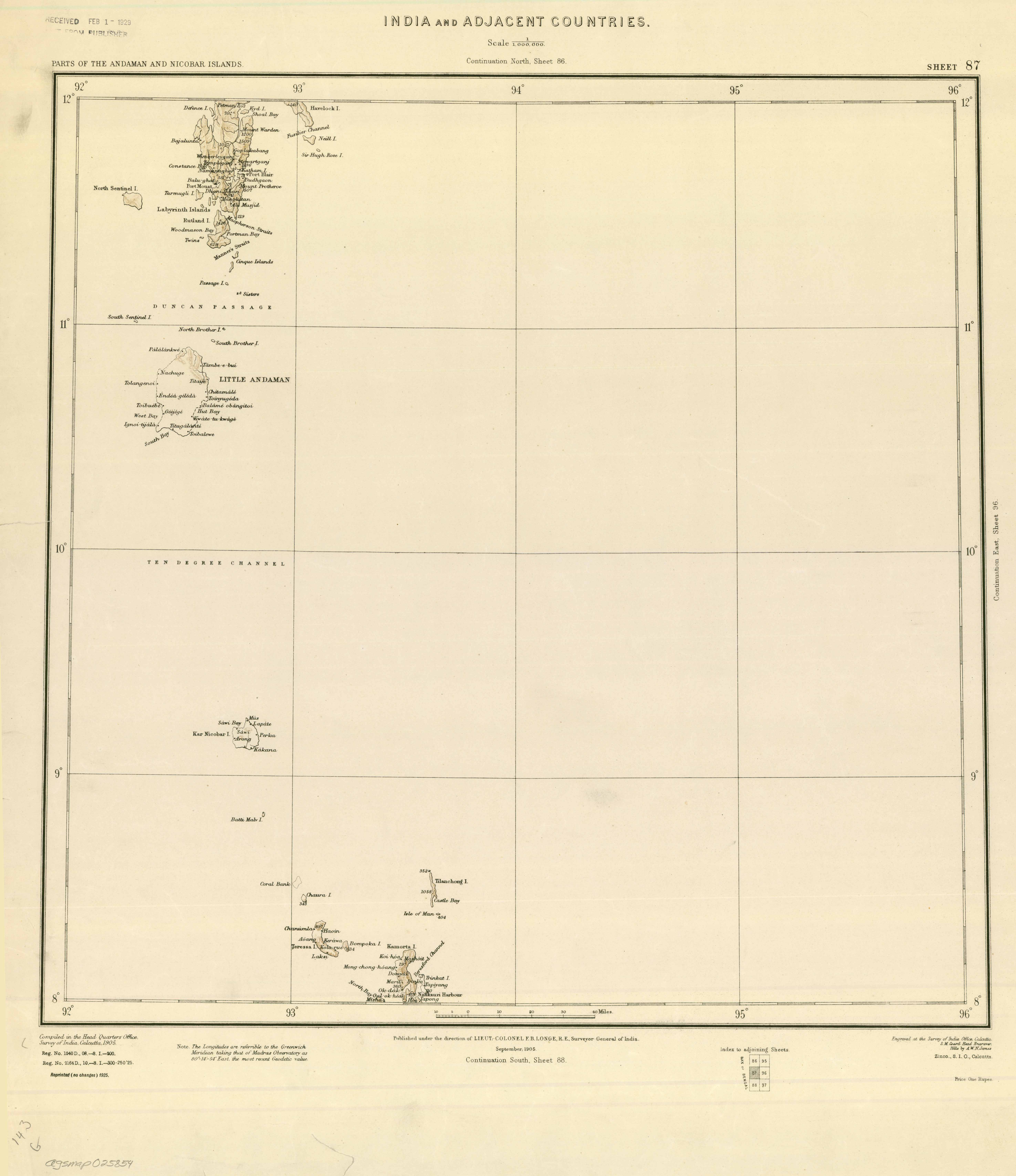 A set of about 200 historical maps of South Asia produced by the Survey of India in the India and Adjacent Countries series, at a scale of 16 miles per 1.014 inches (1:1,000,000). These maps cover the territory from Eastern Persia (Iran) to Western China and date from 1904 to 1942.