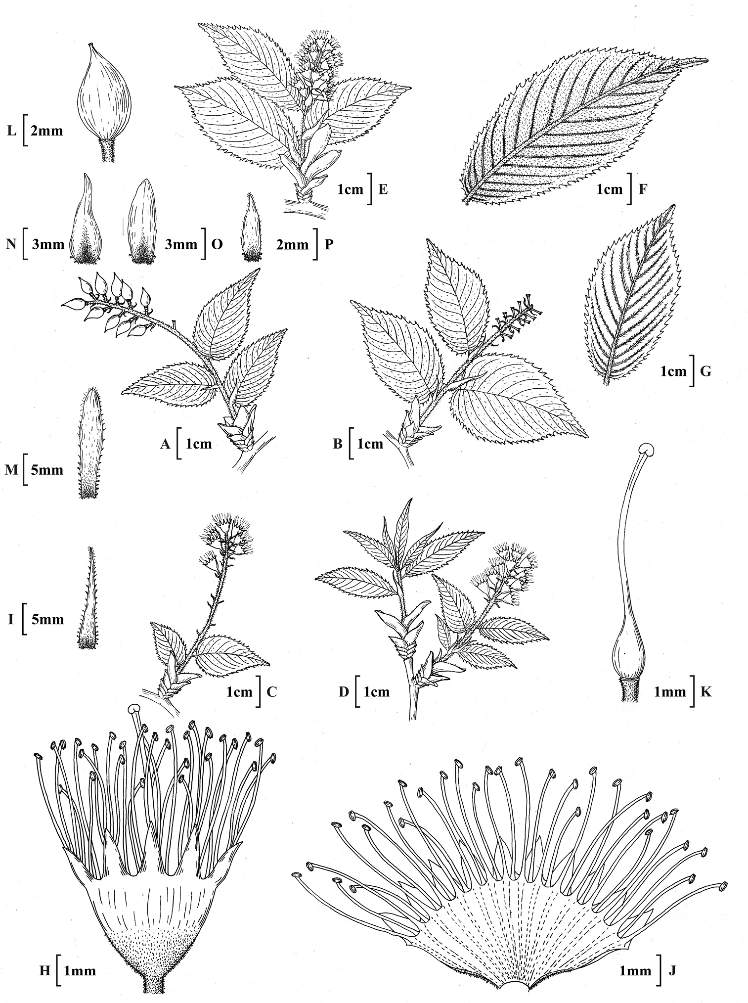 Figure 2 - Prunus hypoxantha (Koehne) J.WenA Habit, fruiting branch B Fallen fruit branch C End of flowering branch D, E Branch in full flower F, G Abaxial leaf surface H Flower I Stipule J Flower K Gynoecium L Fruit M Stipule N–P Bract A, L based on A.Henry 3759 (K) B, F, H, J, K E.H.Wilson 63 (E) E, G, M, N, O E.H.Wilson 909 (K) D E.H.Wilson 63 (K) & E.H.Wilson 3520 (K) P H.Smith 2151 (A) C, I A.Henry 3759 (A).