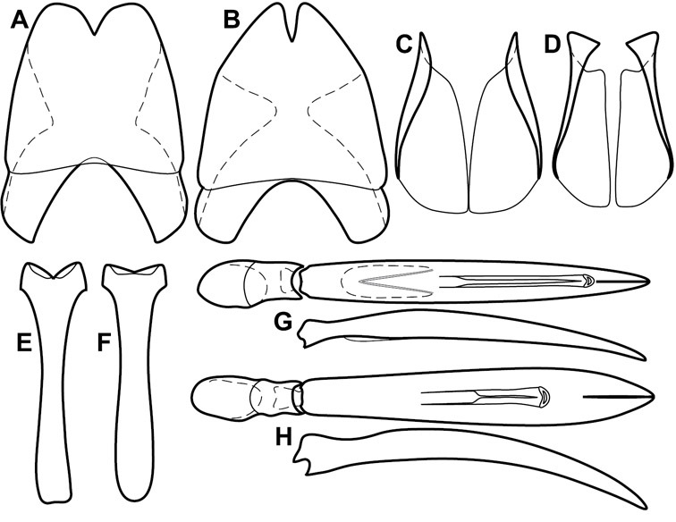 Figure 79 - Male genitalia of Operclipygus impunctipennis group. A T8 of Operclipygus vorax B T8 of Operclipygus chamelensis C S8 of Operclipygus vorax D S8 of Operclipygus chamelensis E S9 of Operclipygus vorax F S9 of Operclipygus chamelensis G Aedeagus, dorsal and lateral views, of Operclipygus vorax H Aedeagus, dorsal and lateral views, of Operclipygus chamelensis.