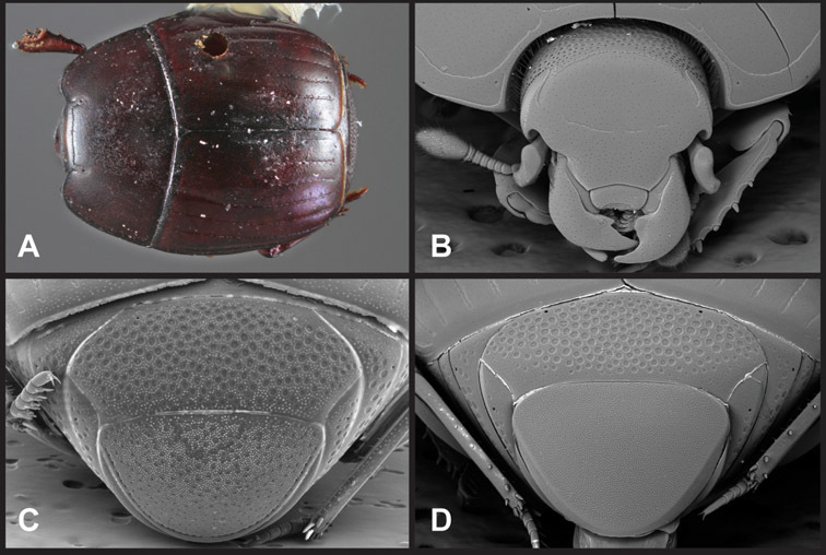 Figure 11 - Operclipygus kerga group. A Dorsal habitus Operclipygus kerga (lectotype) B Frons Operclipygus kerga C Pygidia of Operclipygus punctistrius D Pygidia of Operclipygus planifrons.